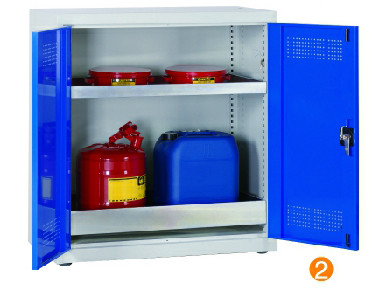 用于污染液體的存儲,可調(diào)式隔板,上下25mm可調(diào) 可移動式底部貯存盤高100mm,無縫焊接,更好防泄漏 門板的頂部及底部帶通風(fēng)孔,自然通風(fēng),門開啟角度12。 隔板/貯存盤式層板每層最大承重60KG (可抽出式除外) 柜體最大承重承重:300KG