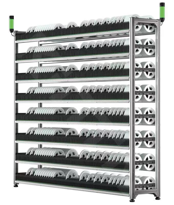 A型智能料架為標準7寸料盤存儲料架,雙面存放,1400個儲位,單色,多色可選,最大可支持7色